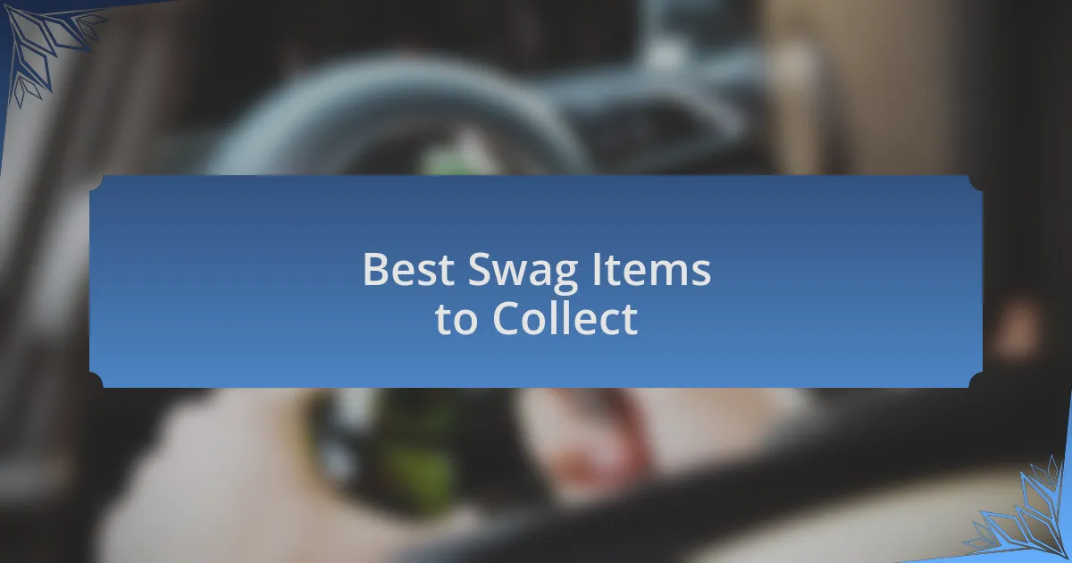 When it comes to the best swag items to collect, one can’t overlook the charm of limited edition bottle openers. I vividly remember discovering a quirky, vintage-style opener at a festival, crafted to resemble a famous beer label. It’s now one of my favorite tools in the kitchen, and every time I use it, it sparks a conversation about that unforgettable festival experience. Don’t you find that having a unique opener not only adds a personal touch to your collection but also serves up great stories?